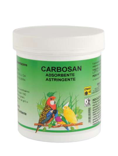 Instrucciones para el uso: poner 4 g de CARBOSAN (una cucharadita de café llena) por 100 g de pasta o semillas o mezclado con el grit o con los sales minerales.